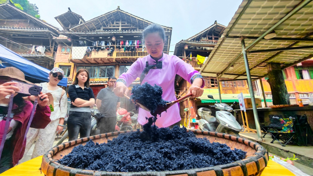 谷雨是春季最后一个节气,在肇兴侗寨,村民将谷雨称为“渐苟嫩堕拉”,寓意“吃乌米、播稻种、祈丰年”。其中,制作和食用乌米饭是重要的传统习俗。乌米饭选取鲜嫩乌饭树叶捣碎滤汁,浸泡糯米后蒸制而成,乌黑透亮、清香四溢,不仅是节日里的专属美味,更是当地男女定亲的吉祥信物,承载着谷雨时节独有的民俗仪式感。