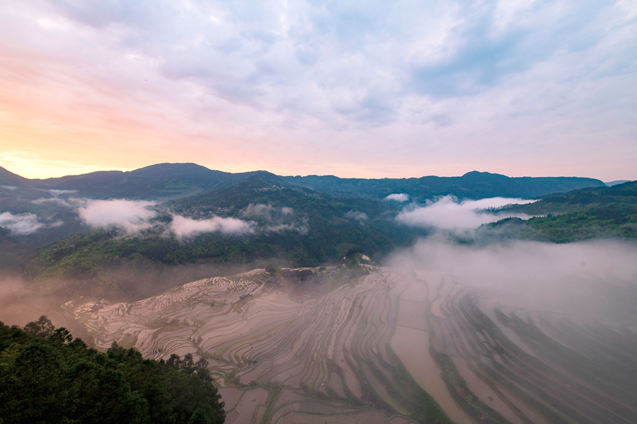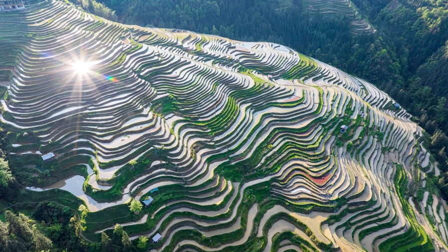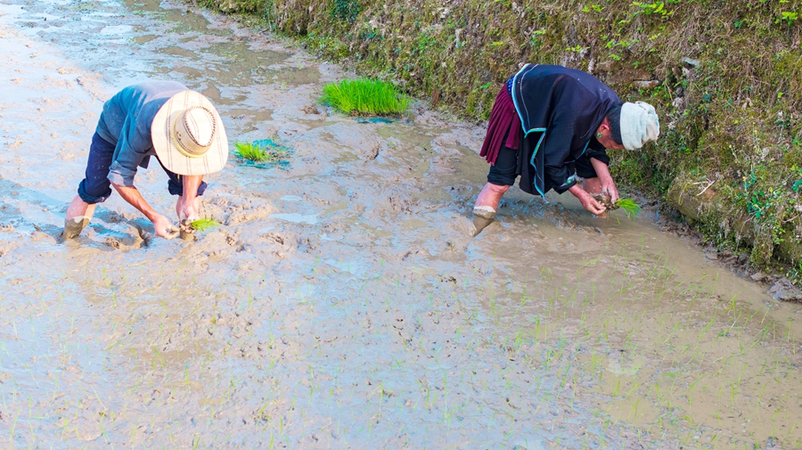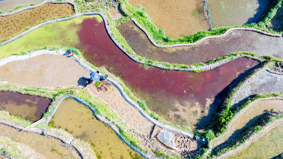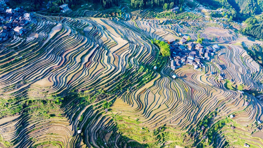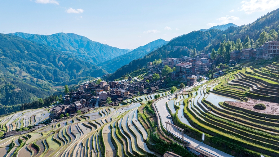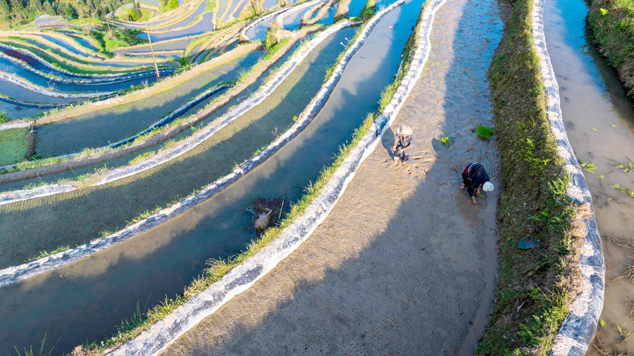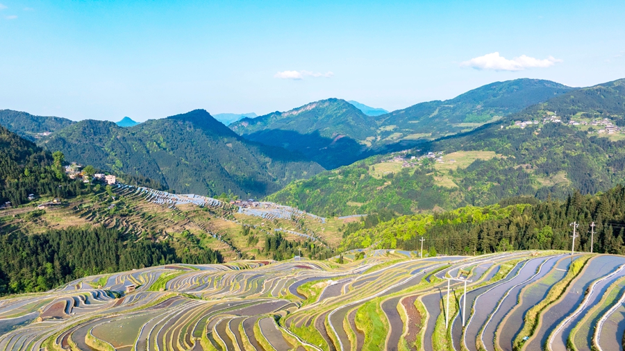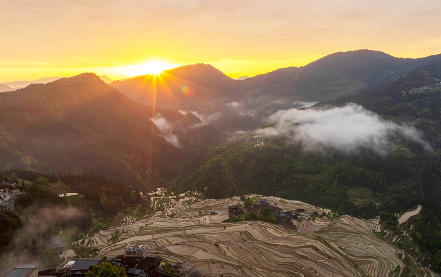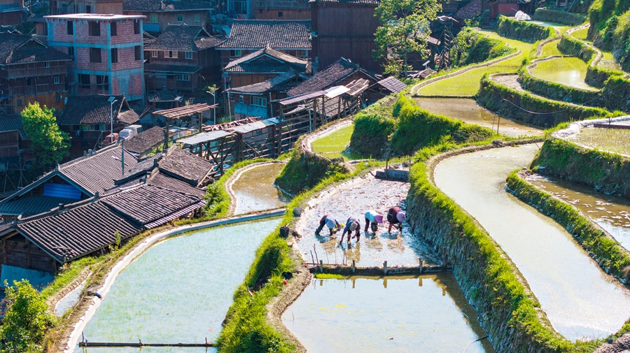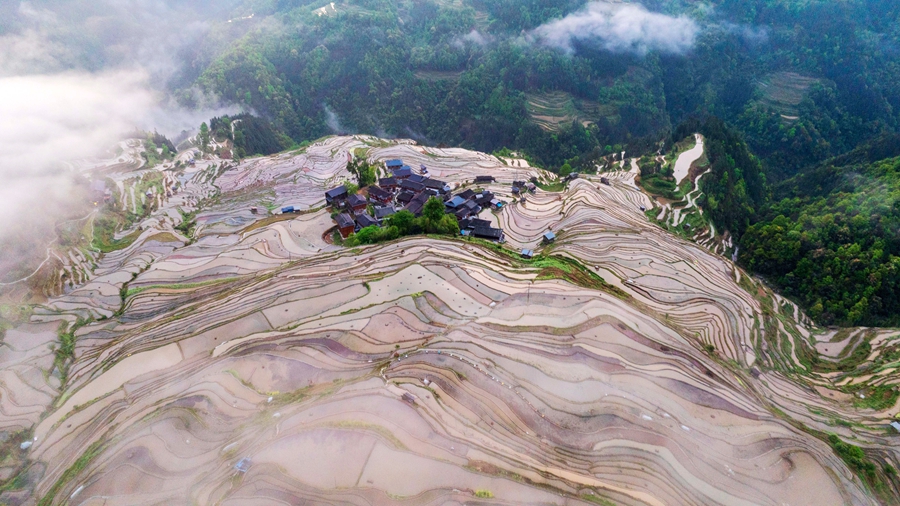 暮春时节,贵州省黔东南苗族侗族自治州从江县加榜乡梯田进入春耕备耕期。村民抢抓农时,开展牛耕、整地、寄秧等传统农事。注水后的梯田如银带缠山,云雾、古村、耕牛与农人相映成趣,绘就春日农耕画卷。