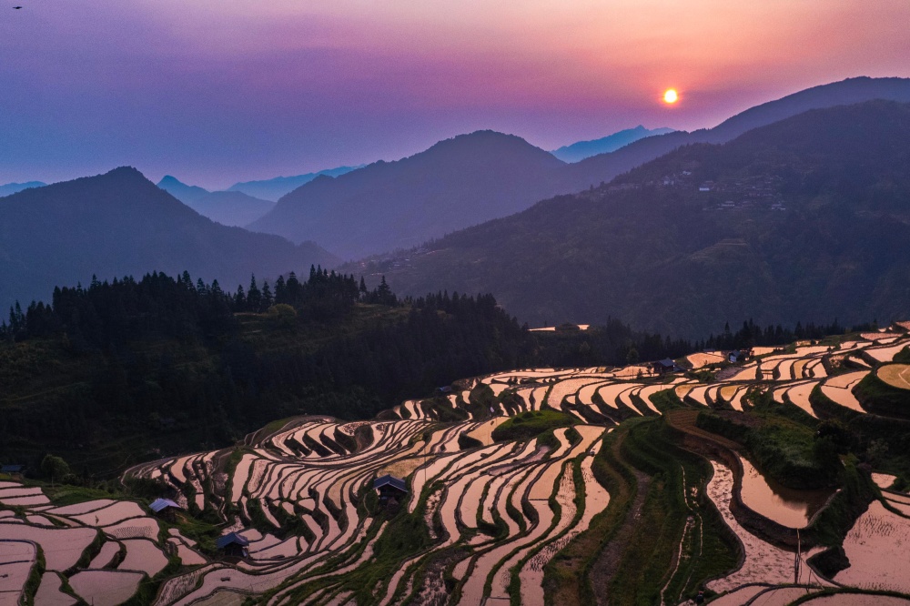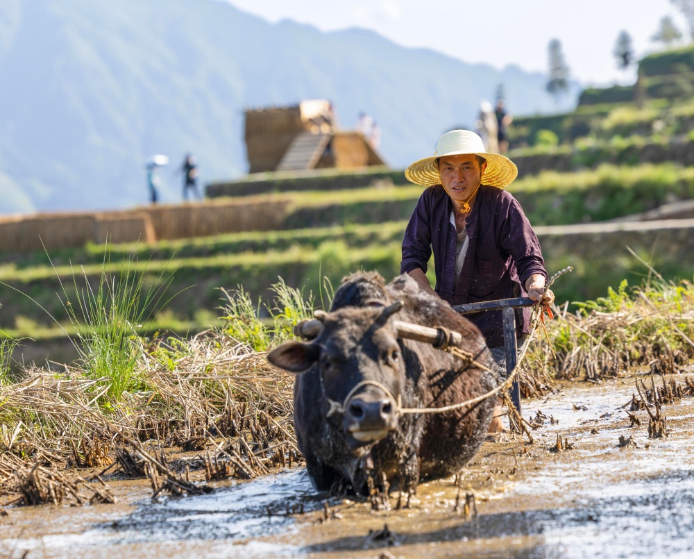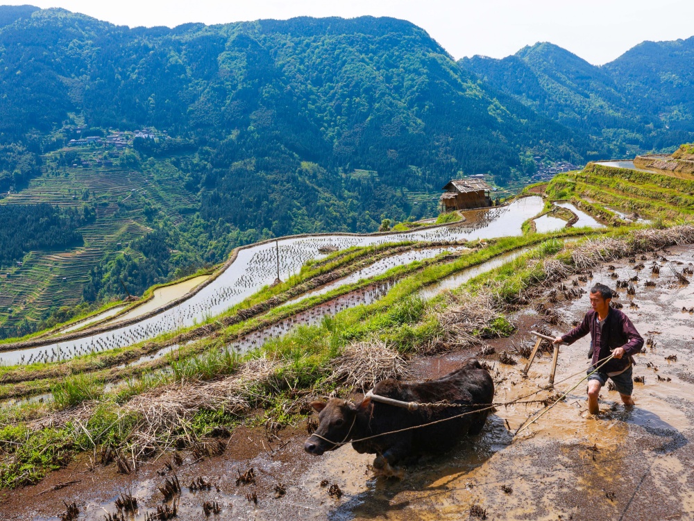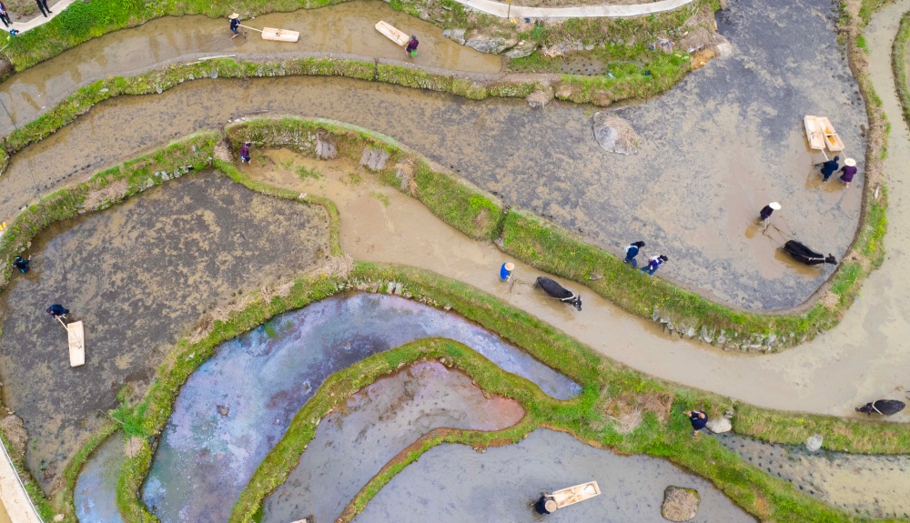 仲春时节,贵州省黔东南苗族侗族自治州从江县加榜乡梯田进入灌水备耕期。当地农户抢抓农时,开展犁田、耙田、育秧、移栽等春耕生产,梯田层层叠叠,勾勒出一幅生动的春日农忙画卷。