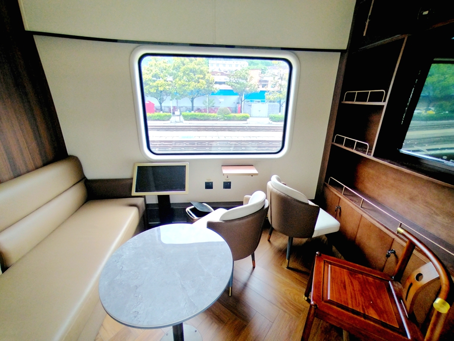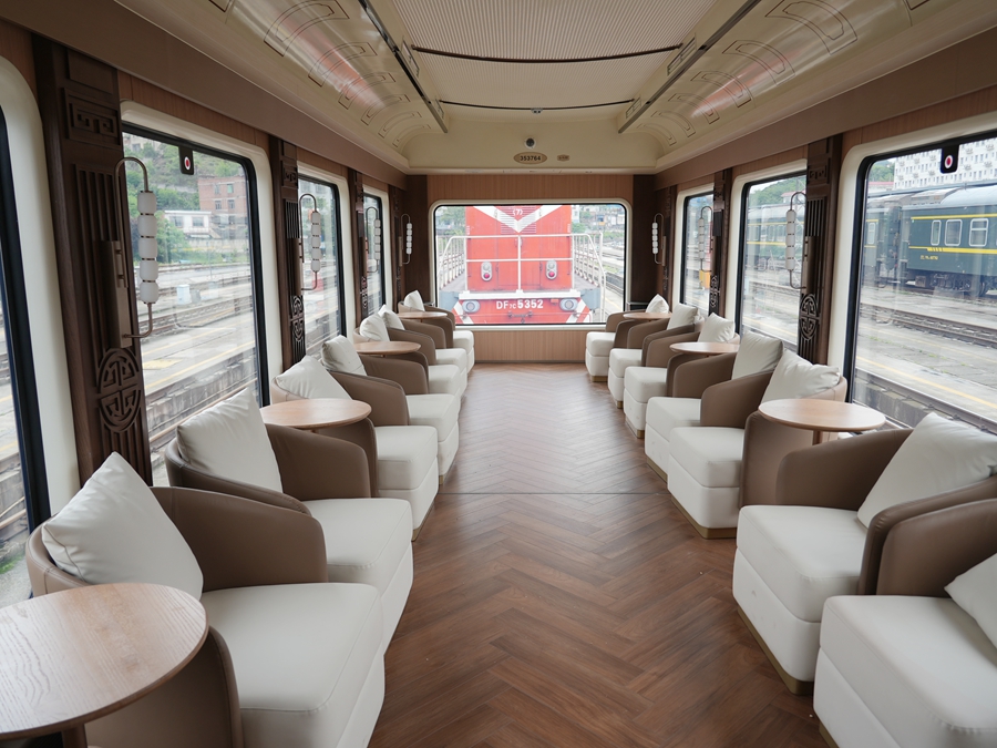 作为专列最大亮点,最后一节全景观景车厢堪称“网红打卡地”!车厢两侧及端部改造为超大落地玻璃,视野毫无遮挡,列车穿行其间,贵州的青山、绿水、田园、村寨尽收眼底,随手一拍都是绝美大片,真正实现“人在车中坐,景在窗外流”。