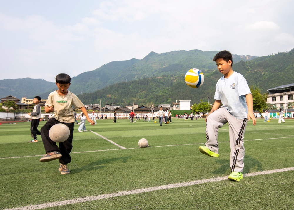 4月27日,从江县刚边壮族乡中心小学足球社团的学生在参加足球基本功训练。