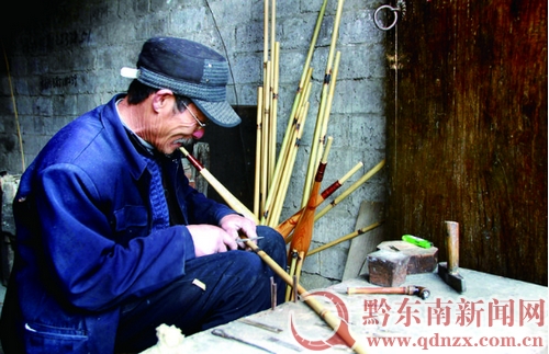 石国玉在制作芦笙