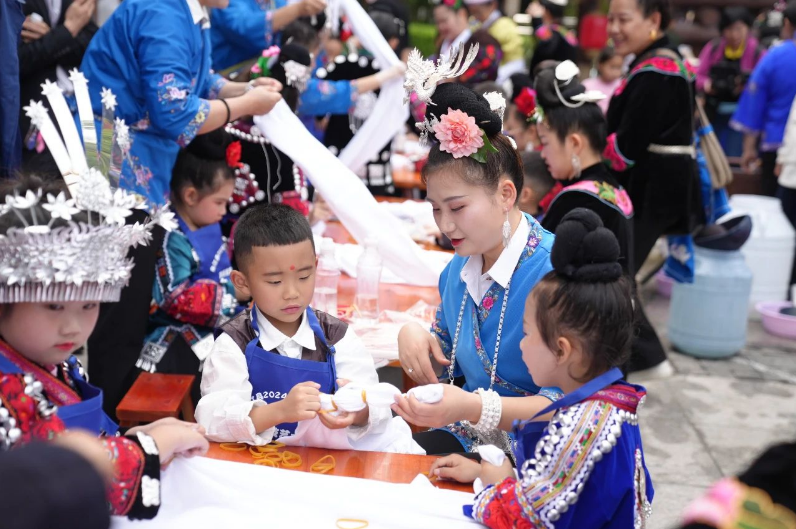 在苗族刺绣体验现场,孩子们身着苗族服饰,穿针引线,在布上灵活运用独特的刺绣针法和色线,绣出一个个做工精美、形式多样、寓意深刻的绣片。