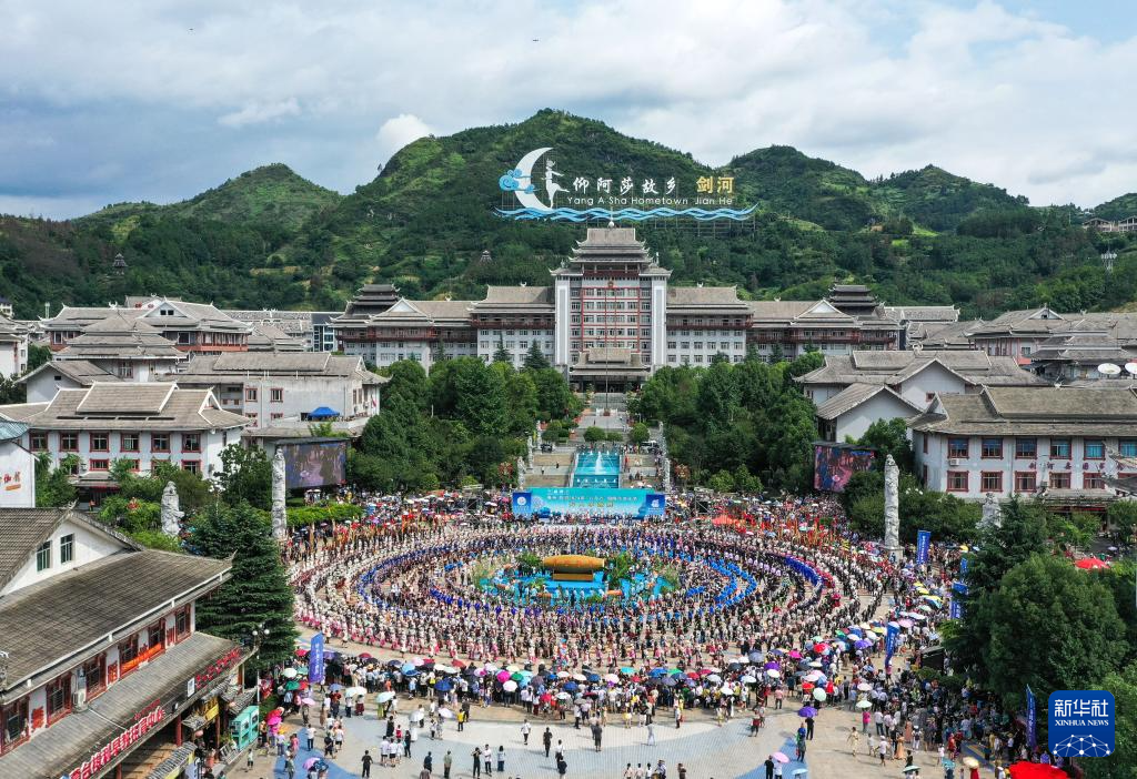 7月13日,少数民族群众在参加贵州剑河仰阿莎文化节民族文化巡演(无人机照片)。新华社记者 杨文斌 摄