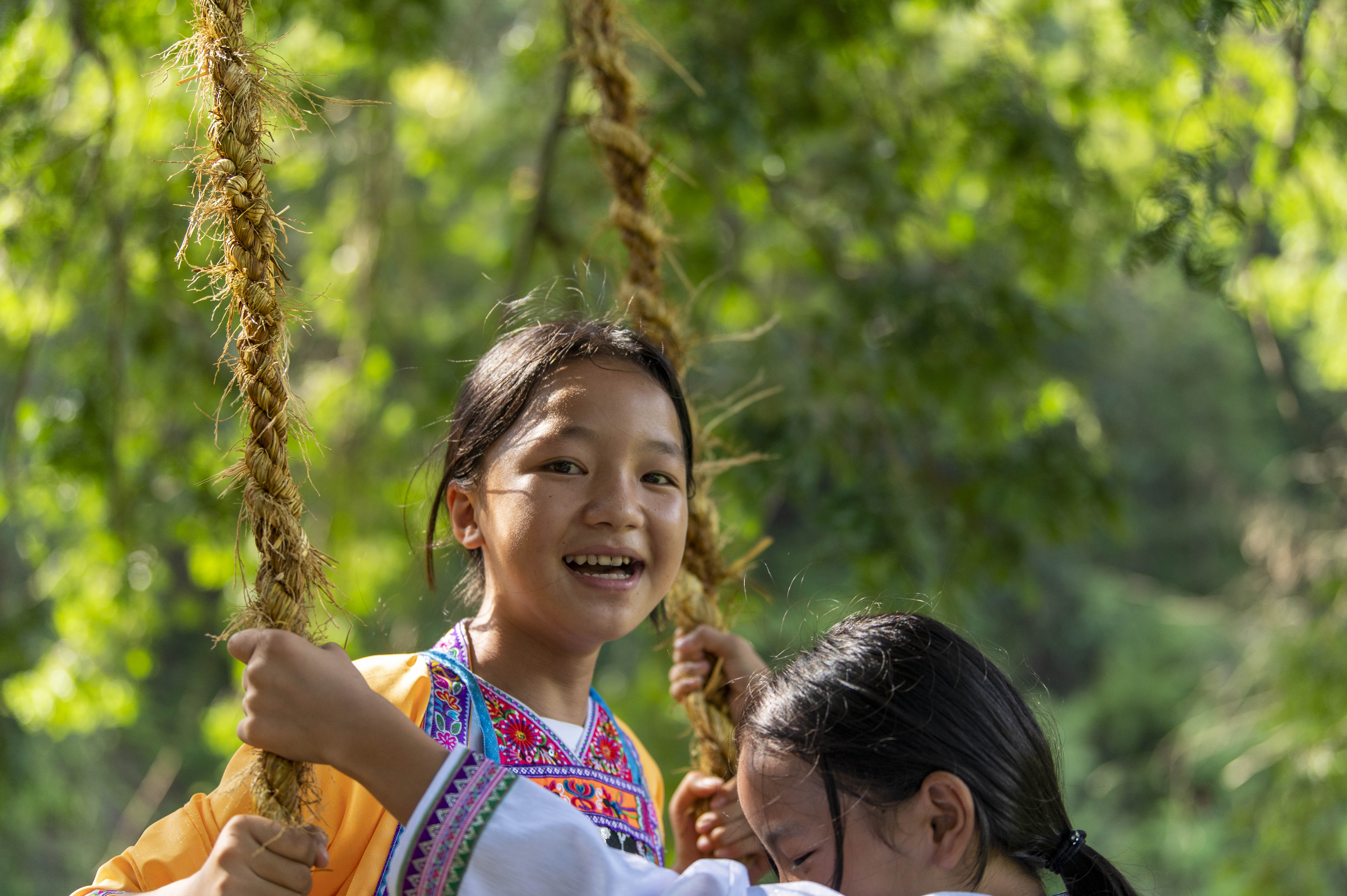 2024年8月10日,在贵州省从江县谷坪乡高武村,苗族小孩在荡秋千。
