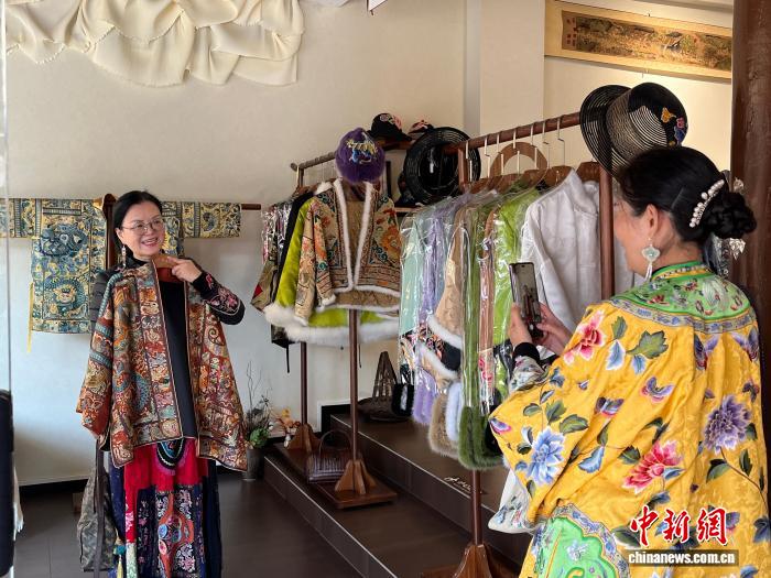 11月15日,贵州凯里,顾客在张理月家的店里挑选苗绣服饰并拍照。中新社记者周燕玲摄