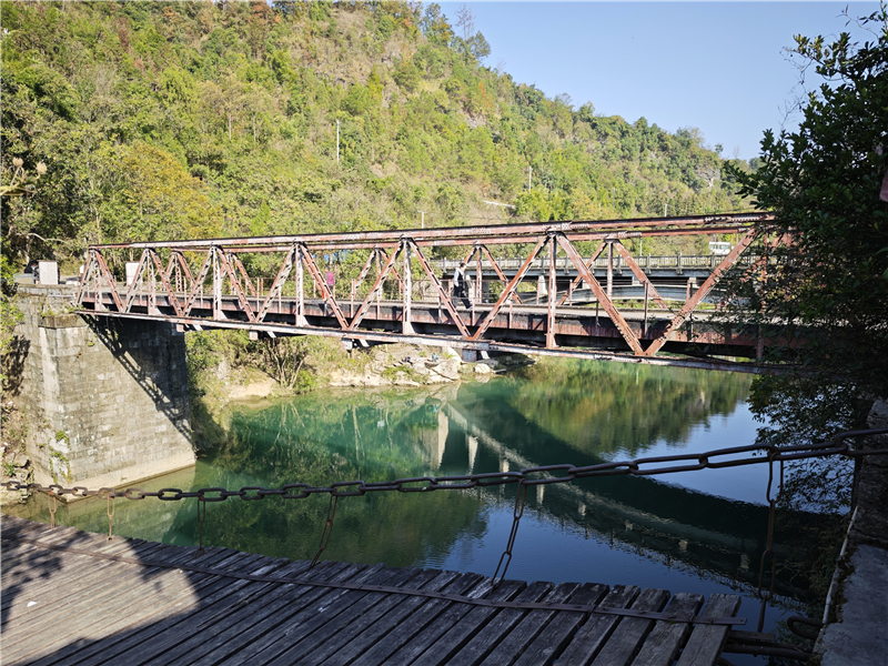 到达对江村观音寺,映入眼帘的便是三桥了。这三座桥横跨江面,相距不过百米,却代表着不同的时代印记,宛如一组立体的桥梁博物馆。江风掠过,铁链发出轻微的“叮当”声,仿佛在诉说百年前的故事。站在桥中央远眺,江水穿过峡谷,对岸的苗家吊脚楼依山而建,在阳光下泛着温润的光,一幅山水与人文交融的画卷就此铺展。