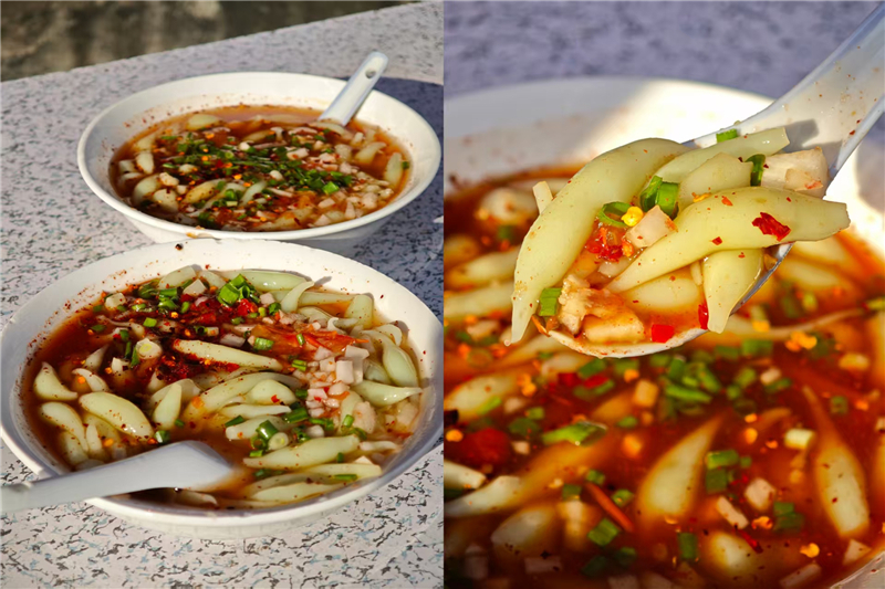 逛完三桥,有一道重安特色美食不可错过。那便是古镇的老街藏着最地道的黔东南风味——重安凉虾。凉虾并非真虾,而是用大米磨浆后煮制,再通过漏勺漏入凉水中凝结而成,形状弯弯曲曲如小河虾,因而得名。白白嫩嫩的凉虾浸在酸萝卜、辣椒、葱花调味的酸汤里,酸爽开胃,一碗下肚,浑身的疲惫都消散了。