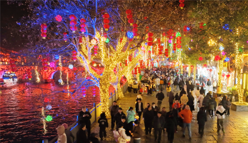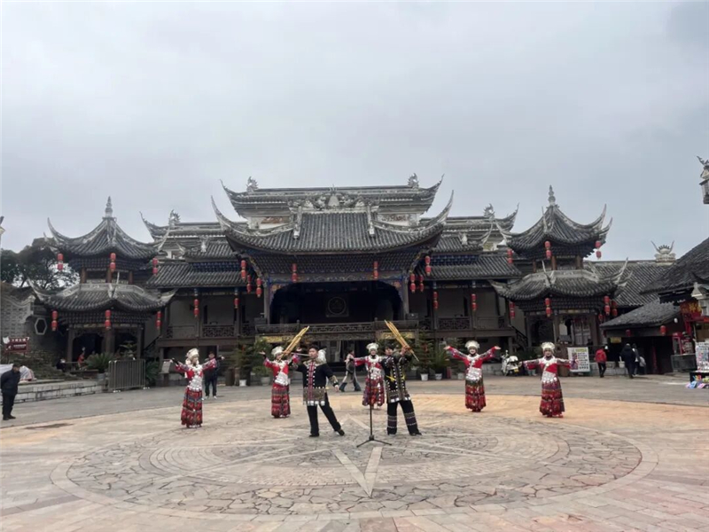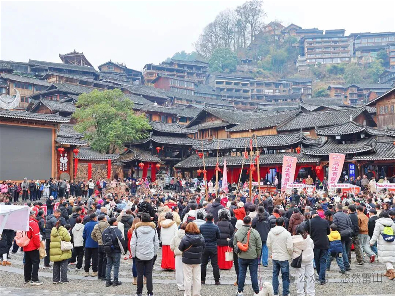 民俗盛宴轮番上演,沉浸式体验苗侗年味。2月16日至3月3日,雷山县西江千户苗寨开启“新春游雷山・苗岭过大年”活动,“马上有喜市”新春市集热闹开市,AI游西江、竹竿舞体验等趣味活动接连推出,夜幕降临,千家灯火点亮苗岭,“高山流水”的待客礼仪、悠扬的苗族飞歌,让游客沉醉在苗家烟火中。