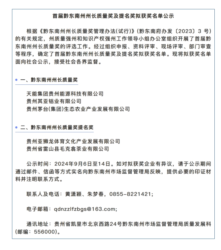 首届黔东南州州长质量奖及提名奖拟获奖名单公示